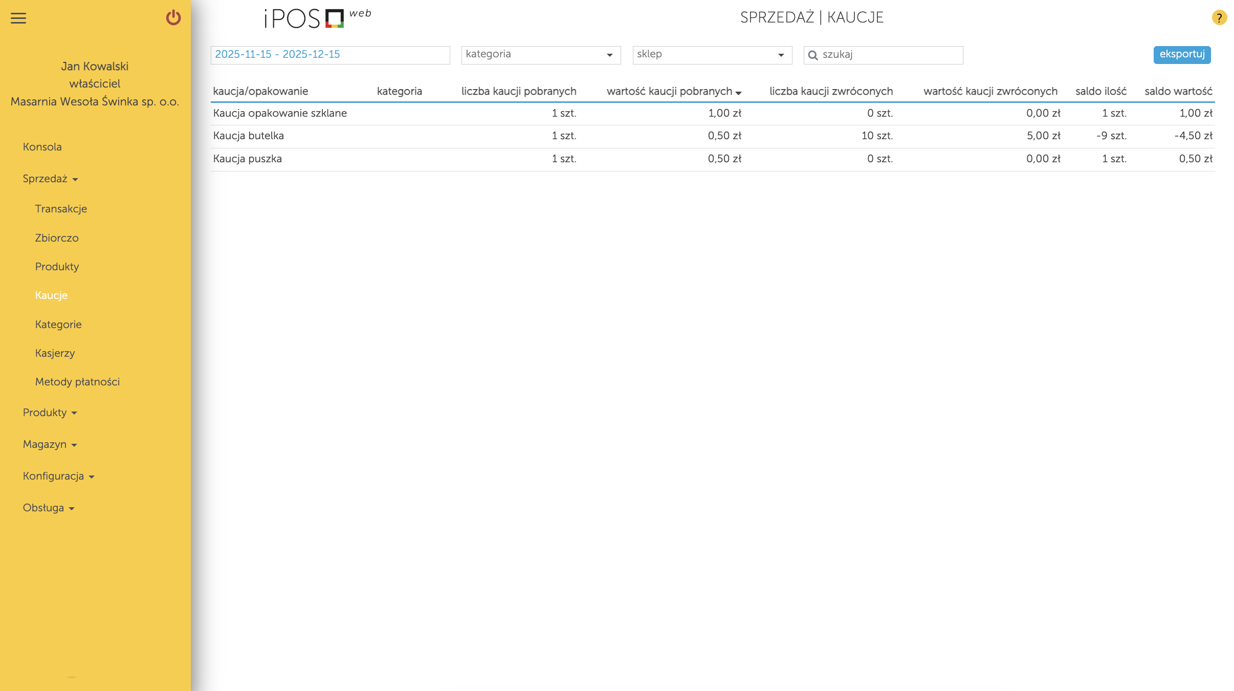 Na platformie iPOSweb w zakładce Sprzedaż-Kaucje możliwy jest do wglądu raport kaucji, prezentuje on m.in. informacje o tym jaki rodzaj kaucji (zgodnie z ustawioną przez Ciebie nazwą) został przyjęty - w jakiej ilości oraz na jaką kwotę.