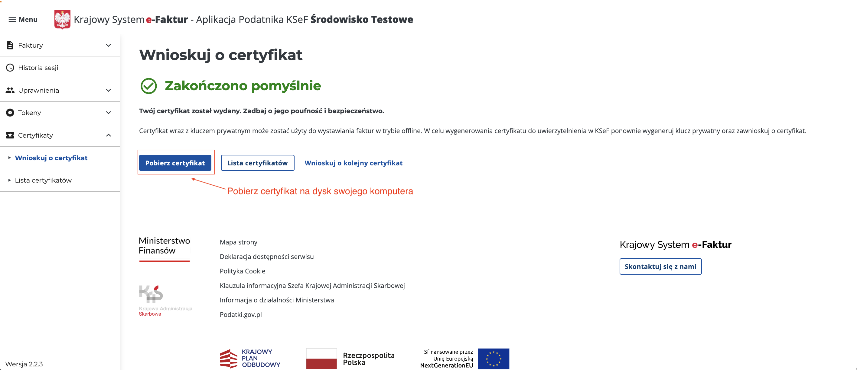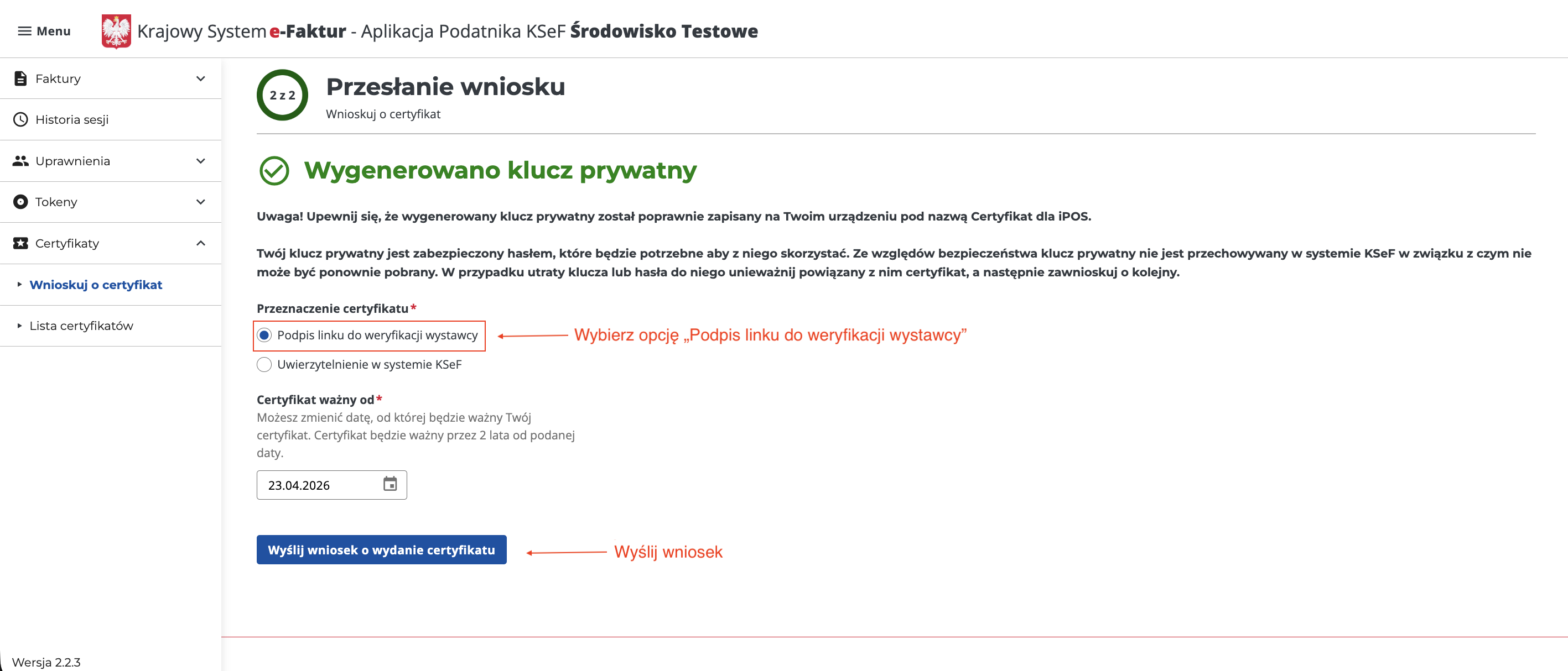 W tym momencie na dysk Twojego komputera pobierze się klucz prywatny nadający dostęp do certyfikatu, a w systemie KSeF przejdziesz na kolejny etap składania wniosku o wydanie certyfikatu (etap 2 z 2).