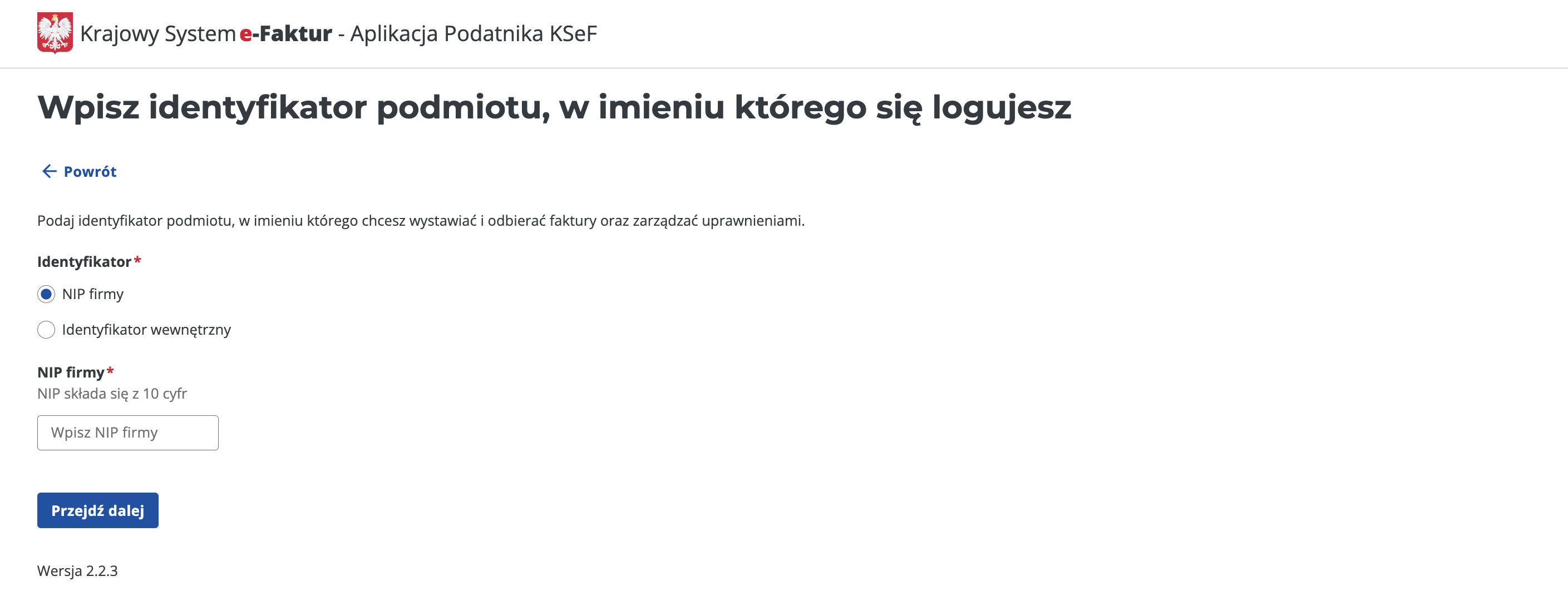 W przypadku logowania przez opcję Zaloguj przez login.gov.pl (Profil Zaufany lub aplikacja mObywatel), podaj NIP firmy i wybierz przycisk "Przejdź dalej".