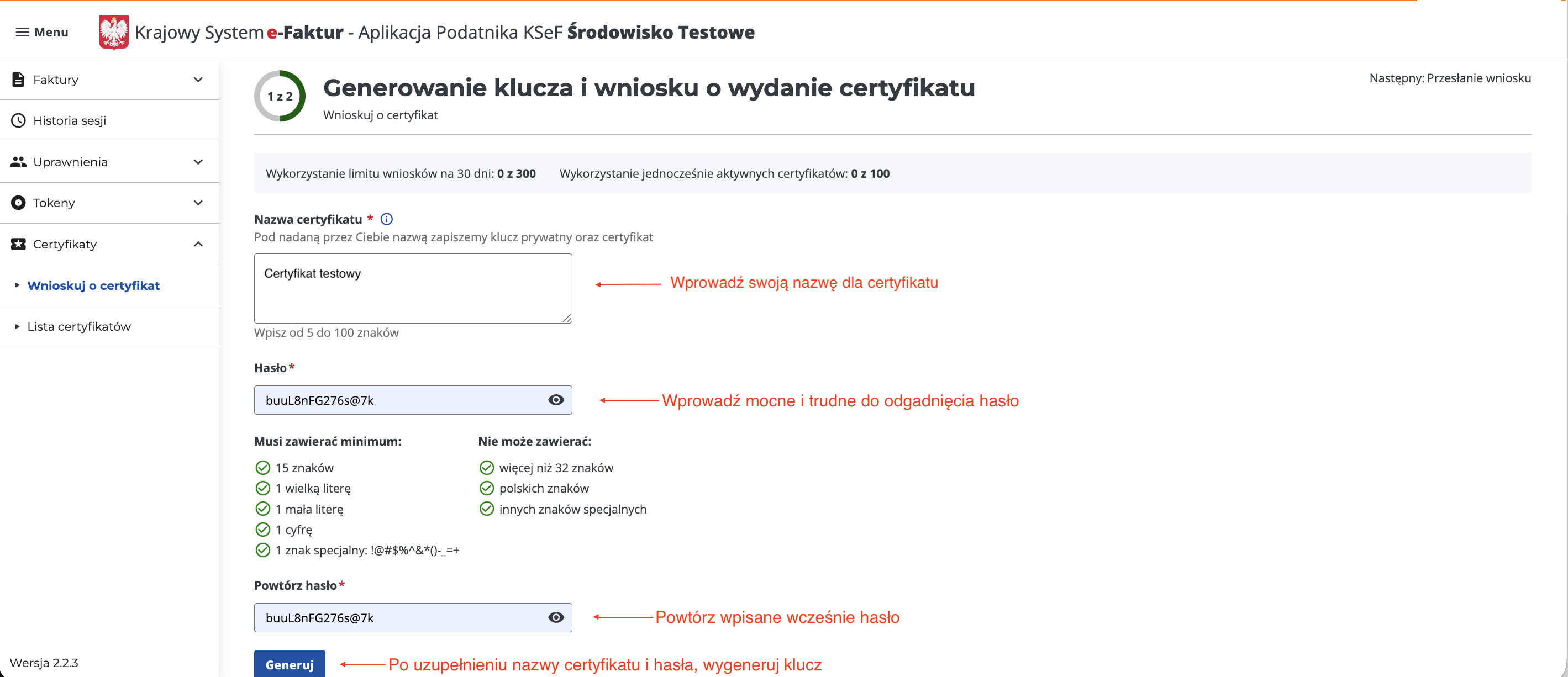 Gdy wyślesz wniosek o wydanie certyfikatu, zostanie on utworzony w systemie KSeF w przeciągu kilku minut.